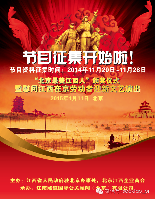 各位江西在京劳动者,各位同乡!《“北京最美江西人”颁奖仪式暨慰问江西在京劳动者迎新文艺演出》这一大型活动,需要你我的积极关注和参与!你或你身边的同乡也许就是我们要寻找的“北京最美江西人”!为传递正能量,让我们一起行动起来,去发现和传播“最美”吧!