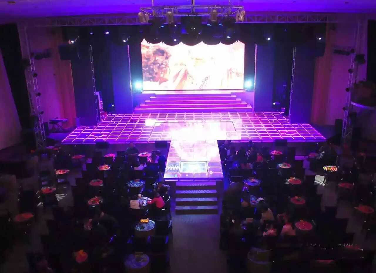 15m×15m的超一流舞台,采用国际通用的品字形布置。主舞台设置全电脑控制的四个升降表演台、电动吊杆;电动幕布等一系列专业设备。舞台采用了国际通用的品字形布置,内设国内顶级可升降舞台、全进口一流的炫彩灯光设备和全线振的专业演出音响,配置数百盏各类专用舞台灯具及先进的专业音响设备,舞台规格气派。
