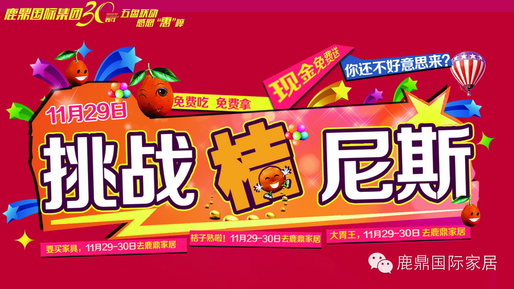 11月29日-30日,来鹿鼎家居免费吃免费拿,现场挑战“桔”尼斯,只要你胃够大,还能赢取精美大礼。