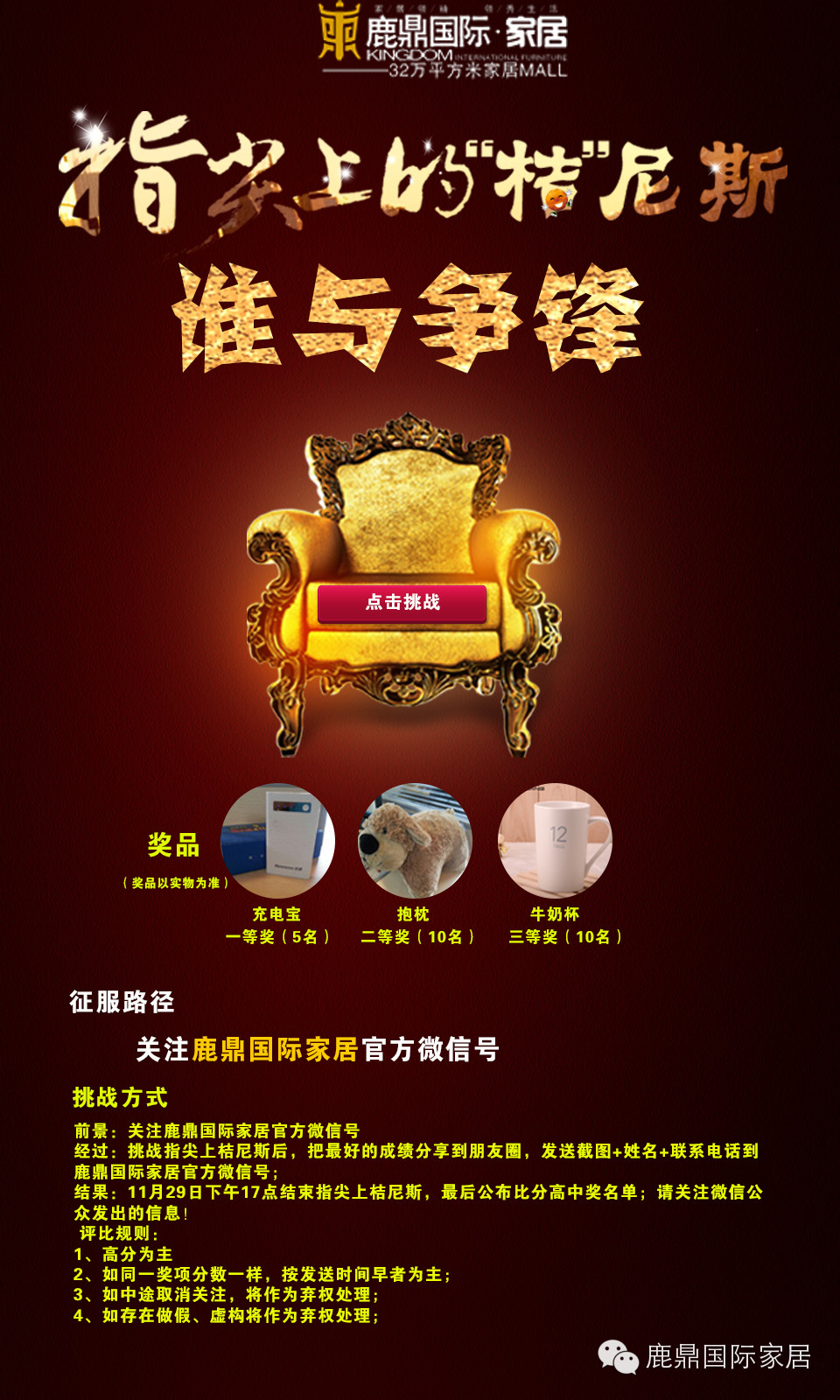 点击本图文最左下角阅读原文四字,就能参与指尖上“桔”尼斯挑战赛,考验大家反应能力的时刻到了您还在等什么,快快加入我们,赢精美礼品咯!亲,一定要将您最好的成绩分享到朋友圈截图+姓名+电话发送给我们哦!(温馨提示:挑战方式及获奖规则请参照上图)